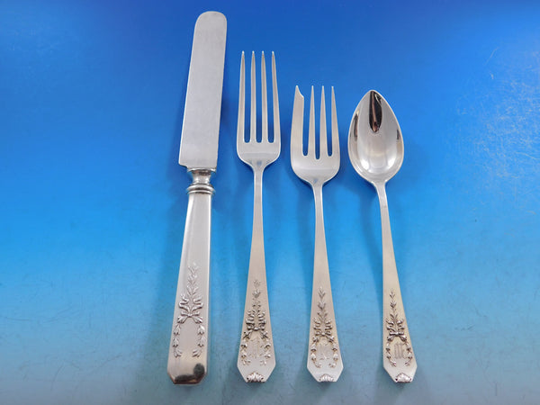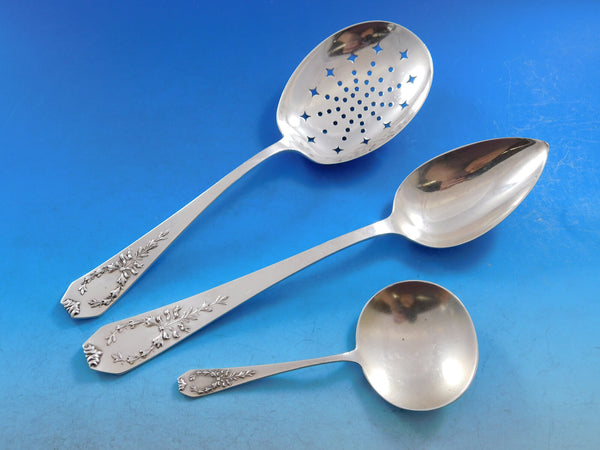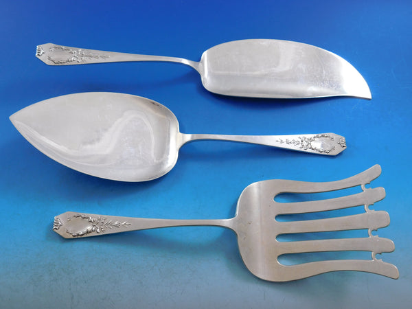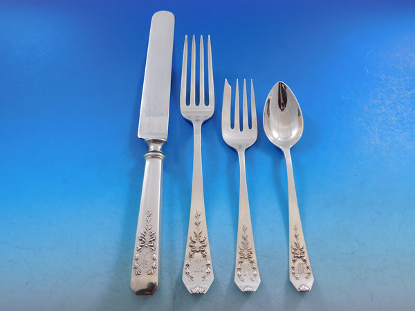 12 Dinner Knives w/blunt plated blades, 9 3/4"12 Dinner Forks, 7 1/2"12 Regular Knives, w/blunt plated blades, 8 7/8"12 Regular Forks, 6 3/4"12 Salad Forks, 4-tine, 6 1/8"12 Teaspoons, 5 7/8"12 Place Soup Spoons, 7"12 Flat Handle Butter Spreaders, 5 3/4"12 Cocktail Forks, 5 5/8"12 Iced Tea Spoons, 7 3/8"12 Bouillon Soup Spoons, 5 1/2"12 Gumbo Soup Spoons, 7 1/4"12 Ice Cream Forks, Original, 5 1/8"12 Grapefruit Spoons, 6"1 Ice Spoon, pierced, 7 3/4"1 Pickle Knife, 6 1/4"1 Asparagus Serving Fork, 8 1/2"1 Gravy Ladle, 7 1/8"1 Serving Spoon, 8"1 Cold Meat Fork, 9"1 Small Cold Meat Fork, 7 1/2"1 Sugar Spoon, 6"1 Flat Handle Master Butter, 7 1/4"1 Pickle Fork, 2-tine, 6 1/8"1 Olive Spoon, original, 6"1 Cheese Server w/stainless blade, 6 1/4"1 Pie Server, flat handle all-sterling, 9 1/4"1 Sauce Ladle, 5 1/2"1 Nut Spoon, 4 3/8"1 Jelly Server, 6"1 Steak Carving Set, 9 1/2" (*wear to steel blade/tines)1 Cake Server w/plated blade, 10"1 Fish Server, flat handle all-sterling, 10"1 Sugar Tong, 4"1 Mayonnaise Ladle, 5 1/4" Includes bonus brand new storage chest - styles vary.Excellent condition, with varying monograms. This set will be beautifully professionally polished prior to shipment.
