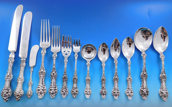 8 Dinner Size Knives, blunt, 9 7/8"8 Dinner Size Forks, 7 5/8"8 Regular Knives, blunt, 8 7/8"8 Regular Forks, 6 3/4"8 Salad Forks, with bar, pierced, 6" 8 Teaspoons, 5 7/8"8 Place Soup Spoon, 7 1/8"8 Flat Handle Butter Spreaders, 5 1/8"8 Cocktail Forks, 5 5/8"8 Bouillon Soup Spoons, 5"8 Gumbo Soup Spoons, 6 7/8"8 Grapefruit Spoons, 5 3/4"8 Coffee Spoons, 5 1/4"2 Serving Spoons, 8 3/8"1 Cold Meat Fork with flowers, 7 5/8"1 Sugar Spoon, 6"1 Flat Handle Master Butter, 7 1/4"1 Pickle Fork, 3-tine, 6"1 Original Cheese Scoop, 7 1/2"1 Preserve Spoon, 7 3/4"1 Berry Spoon, 9 1/4"1 Beef Fork, splayed, 5 3/4"Includes bonus brand new storage chest - styles vary.Excellent condition, with no monograms. This set will be beautifully professionally polished prior to