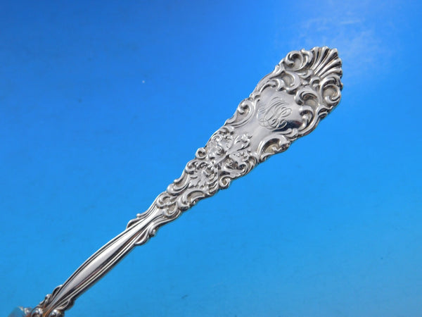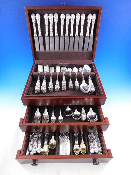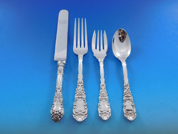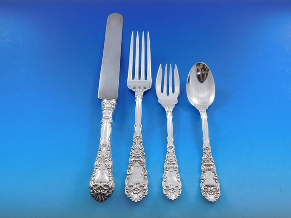 Exquisite figural Renaissance by Dominick and Haff flatware set, 168 pieces. The Renaissance pattern was patented in 1894. The handle front and the back at the base of the handle are decorated with scroll designs and a classic bearded man's face symbolizing Old Man Winter, the North Wind, or in Greek mythology, Boreas - the god of cold weather. T