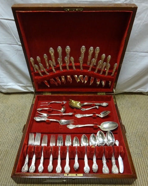 RICHELIEU BY TIFFANY CO. sterling silver Flatware set -81 Pieces IN LARGE VINTAGE CHEST. This set includes:6 DINNER SIZE KNIVES, 10" 6 DINNER SIZE FORKS, 7 1/2" 6 LUNCHEON KNIVES, 9" 6 LUNCHEON FORKS, 6 3/4" 6 TEASPOONS, 5 7/8" 6 PLACE SOUP SPOONS, 7" 6 FLAT HANDLE BUTTER SPREADERS, 5 7/8" 6 SERVING SPOONS, 8 1/2" 1 COLD MEAT FORK, PIERCED, 9" 1 SAUCE LADLE, 7" 1 LONG SALAD SET, GOLD-WASHED, 10" 1 BAKED POTATO FORK, 6 3/4" 12 FISH FORKS, ALL-STERLING, 7" 12 FISH KNIVES, HOLLOW HANDLE, ALL-STERLING, 7 5/8" 1 LETTUCE FORK, 8 3/4" 1 MUSTARD LADLE, 4 1/2" 1 SPAGHETTI SPOON, 8 1/4" 1 STUFFING SPOON W/BUTTON, 11" Includes LARGE VINTAGE (not Tiffany) storage chest - chest as-is vintage condition.