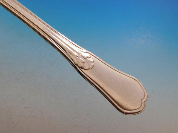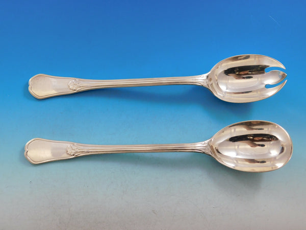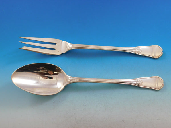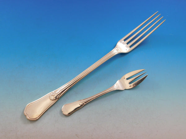 12 Dinner Size Knives, w/pointed stainless blades, 9 3/4" 12 Large Dinner Size Forks, 8 1/4" 12 Luncheon Knives, w/pointed stainless blades, 8" 12 Luncheon/Salad Forks, 6 3/4" 12 Small Teaspoons, 4 3/4" 12 Flat Handle Butter Spreaders, 5 1/4" 12 Demitasse Spoons, 4 1/8" 12 Dessert Spoons, 6 3/4" 12 Fish Knives, flat handle all-sterling, 8" 12 Fish Forks, 7" 12 Large Dinner Spoons, 8 1/4" 11 Oyster Forks, 3-tine, 5 1/2" 1 Fish Server, 10 1/4" 1 Fish Serving Fork w/bar, 8 3/4" 1 Ice Cream Slice w/stainless blade, 10 1/4" 1 Vegetable Serving Set, 3-tine, 10 3/8" 1 Serving Spoon, 8 1/4" 1 Pickle Fork, 5 1/2" 1 Salad Serving Set, all-sterling, 10 1/4" 1 Sauce Ladle, 6" 1 Hors D'oeuvre Set, 3-pc: Petit-four Server 6", Sardine Server 5 1/4", Sardine Serving Fork 5 1/4" 1 Asparagus Serving tong, 8" 1 Sugar Sifter, pierced, 5 5/8" 1 Buffet Fork, 4-tine, 10 1/4"