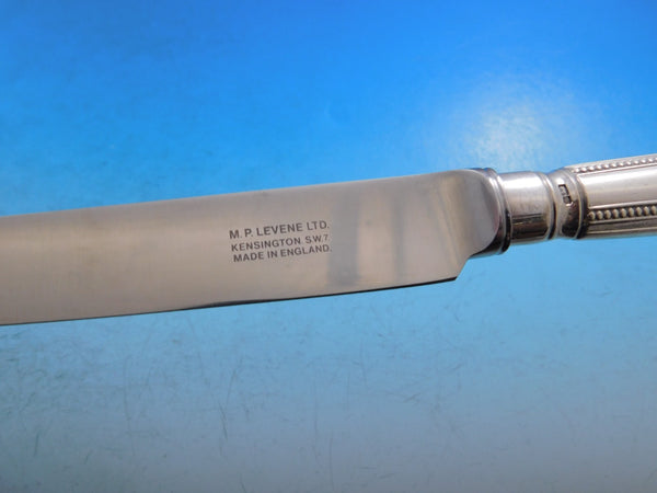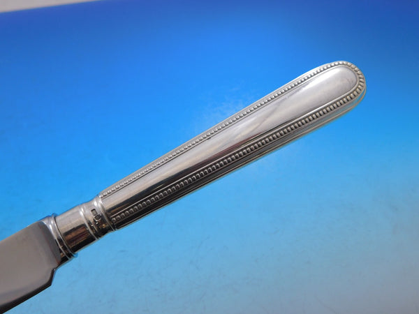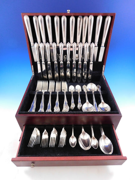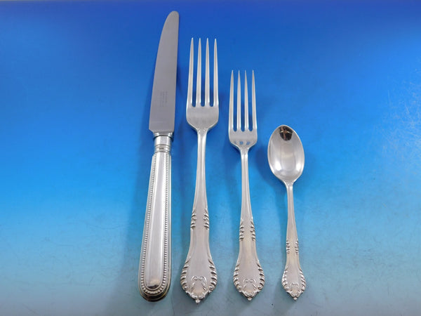 12 Extra Large Dinner Size Knives, 10 1/4" (Bead Round by CJ Vander)12 Extra Large Dinner Size Forks, 8 1/8"12 Salad Forks, 7 1/8"11 Teaspoons, small, 5"12 Cream Soup Spoons, 7 1/8"12 Coffee Spoons, 4 5/8"12 Dessert Spoons, 7 1/4"10 Fish Knives, hollow handle, all-sterling, 8 3/8"11 Fish Forks, hollow handle, all-sterling, 7 3/4"Includes bonus brand new storage chest - styles vary.
