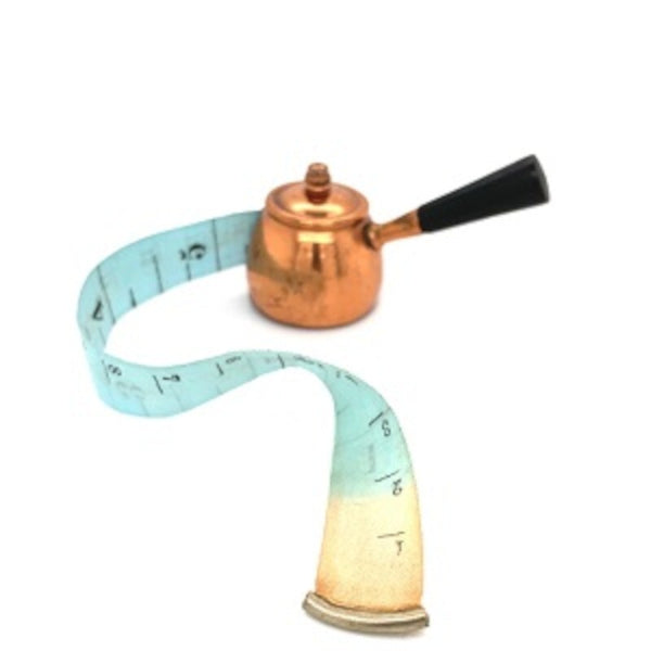 Wonderful copper plated on brass measuring tape in the form of a pot or sauce pan with black ebony handle. It measures 1 1/4" tall and 2 1/4" long. Knob winds the tape. Some wear. Terrific piece!