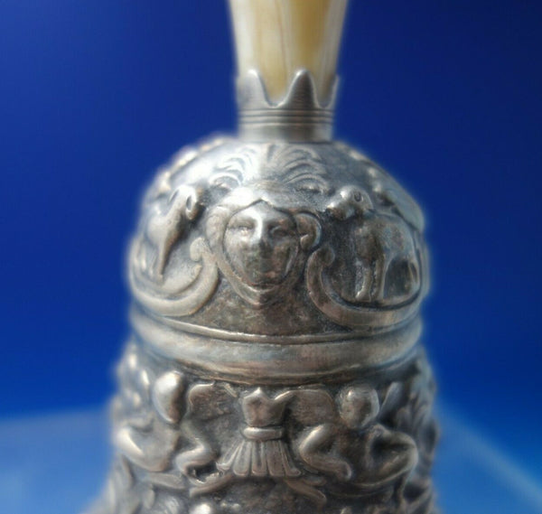Fabulous old Florentine Gorham silverplate with faux ivory handle dinner bell marked #042 with figures. This bell measures 5 1/4" tall x 2 3/4". It is engraved "Old Florentine Bell" and is in good vintage condition as shown in the photos, some minor age cracks in the handle, as expected with age.