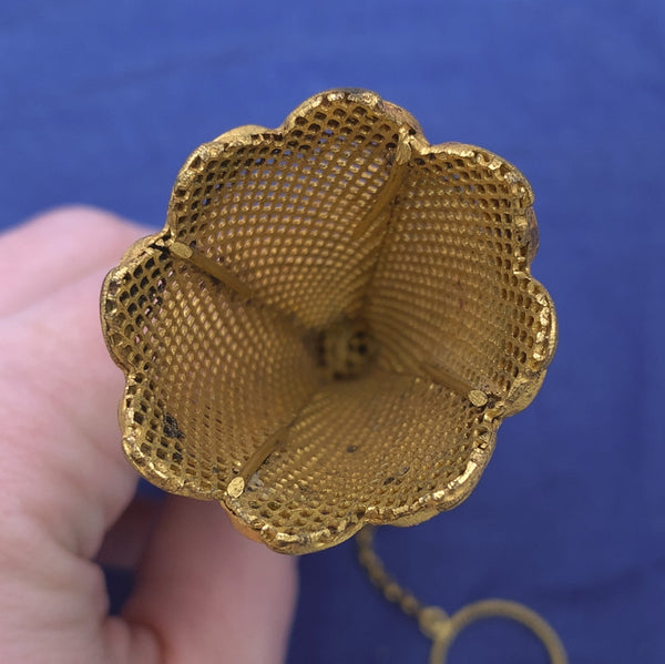 Gilt metal tussie mussie with mesh cup studded with five turquoise gems and a carved mother or pearl handle. The cup has four sections with a scalloped rim. There is a mesh ball shape with two applied leaves. Some of the tiny turquoise stones look like replacements.