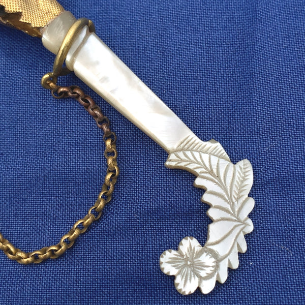 The carved mother of pearl shell handle has a flower with leaves. It measures 4 7/8" long and 1 3/8" diameter of the cup. Good condition with some corroding of the metal (a little green by the leaves). It has the original chain with ring attached. Wow!