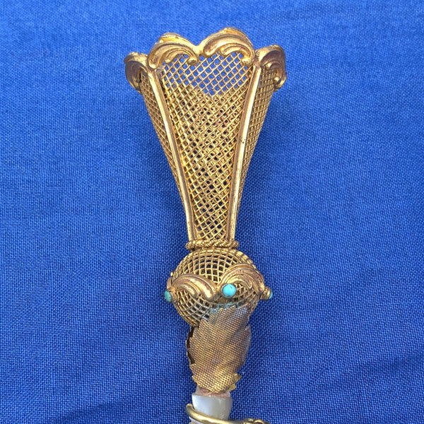 Gilt Tussie Mussie w/ Mesh Cup Mother of Pearl Shell Handle and Turquoise #J7460