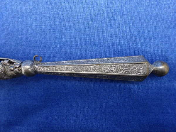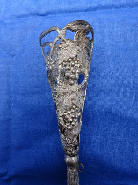 Wonderful silvered bronze tussie mussie with grapes, leaves, and vines. Larger size measuring 6 5/8” long and 1 3/8" diameter at the top. There is some plate loss and corroding. Open loop is missing pin and ring. Vintage to newer piece. Terrific!