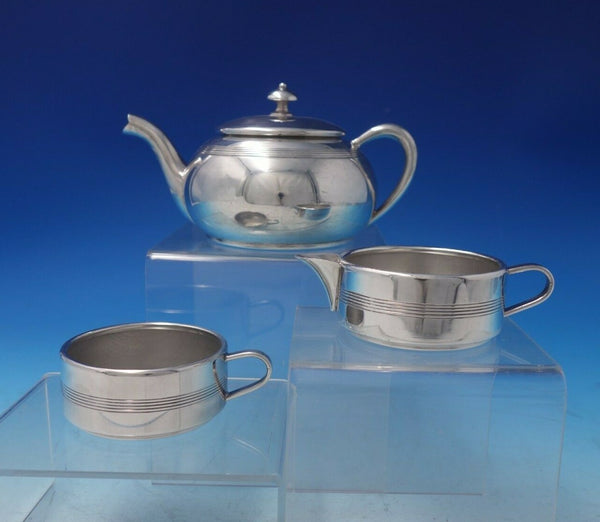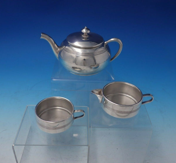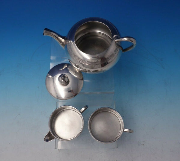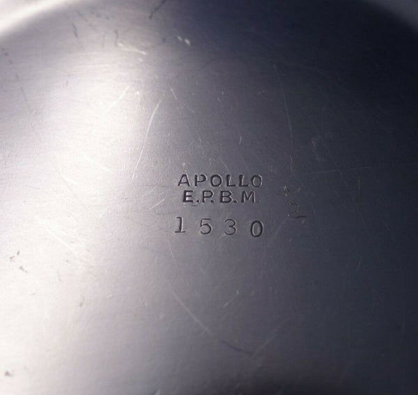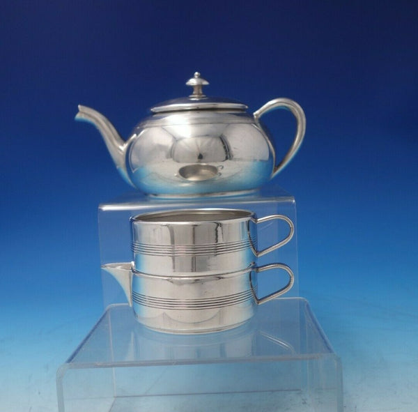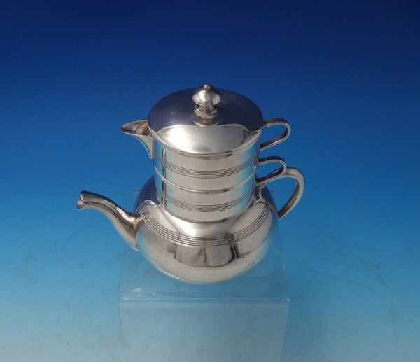 Amazing Apollo silverplate single serving tea set marked #1530 (maker unknown). This set features a tea pot, creamer, and cup with lid which are able to be stacked together.