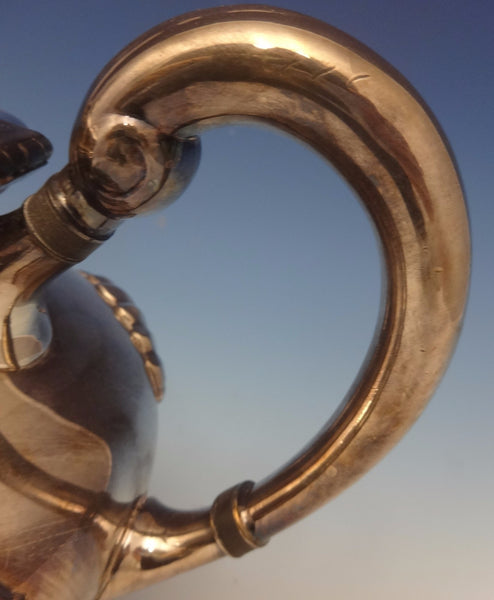 Onslow by Tuttle 6-piece silver plated tea set. The pieces are all marked #6000 and the set dates from the 1960's. The set includes:Coffee Pot: Measures 10" tall and 12" wide with handle. Tea Pot: Measures 8 1/4" tall and 11" wide with handle. Sugar Bowl: Measures 5 3/4" tall and 8" wide. Creamer: Measures 4 1/2" tall and 6 1/2" wide.