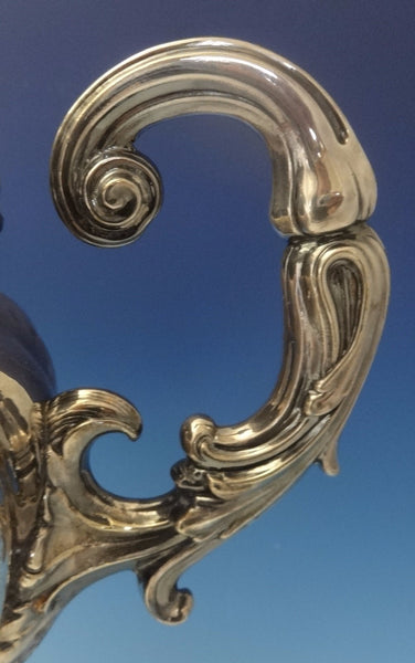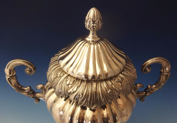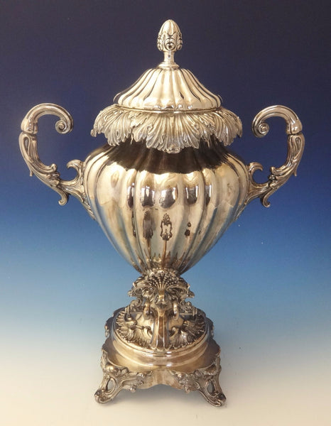 Large English silverplate hot water urn or samovar. It features a wide rim of leaf and scrollwork and a ribbed body. It dates from the 1880's and measures 20" tall and 16" wide. It is not monogrammed and is in very good, very clean condition, with minor surface scratches as expected.