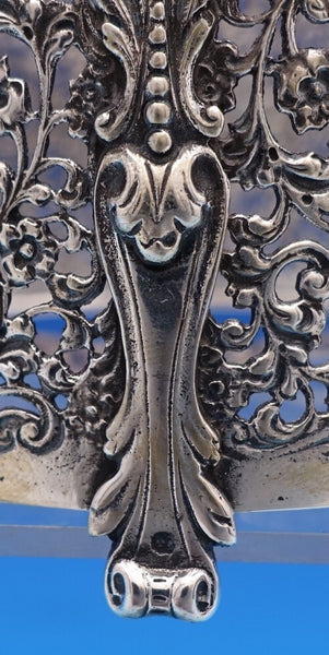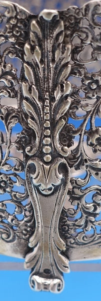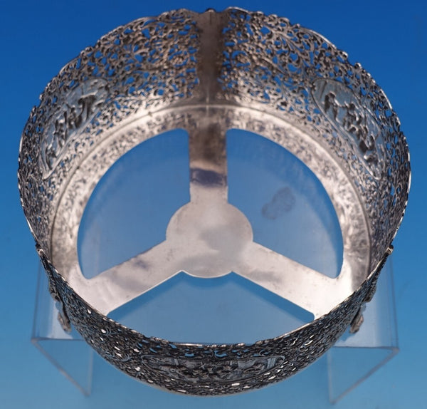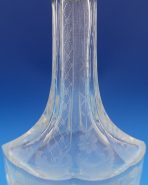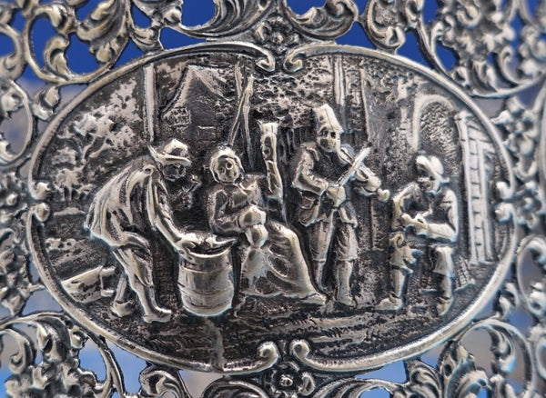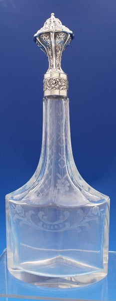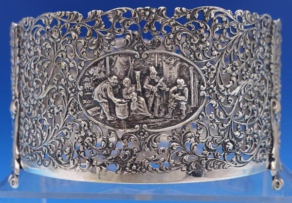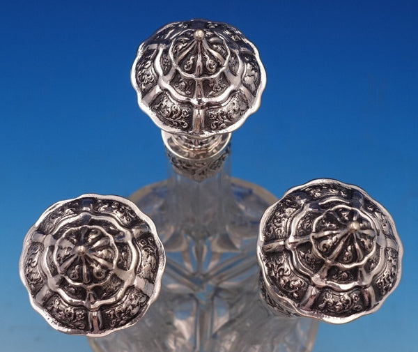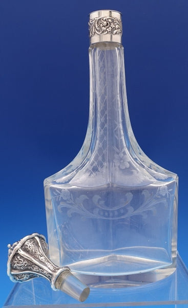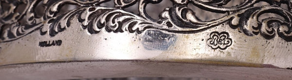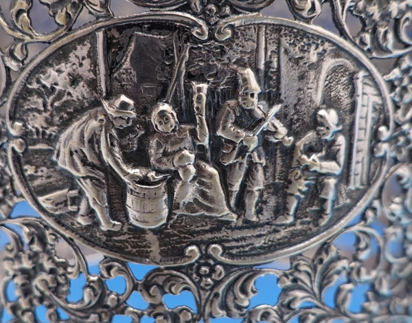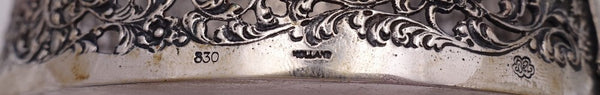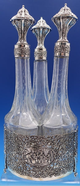 Dutch (Holland) 830 silver glass liquor bottle set of 3 with silver holder. The liquor bottles have silver tops and the glass is hand engraved. The footed silver holder features openwork with scrolling floral design and a musical group of Dutch figures in a central oval cartouche. Overall this set measures 10 3/4" tall x 5 1/2". It is not monogrammed and is in good vintage condition. Beautiful set!