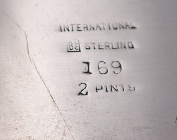 Continental by International sterling silver large flask stamped #169, 2 PINTS. It measures 9" tall x 5 1/4" wide and weighs a heavy 19.6 troy ounces. It is not monogrammed and is in good vintage condition with a few minor dings/imperfections, as expected with age. Wonderful piece!
