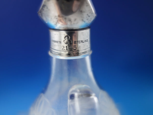 Amazing cut crystal oil cruet with sterling silver lid and spout by Hawk, circa 1910. The cut glass features a bow and flower motif. This piece measures 5" tall x 2". It is not monogrammed and is in good vintage condition. Fantastic!