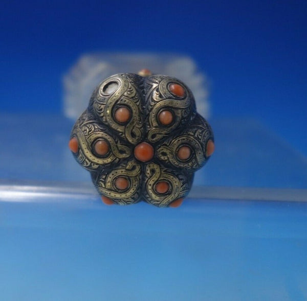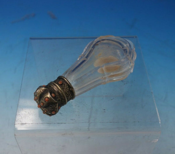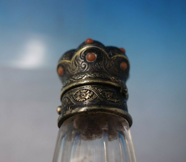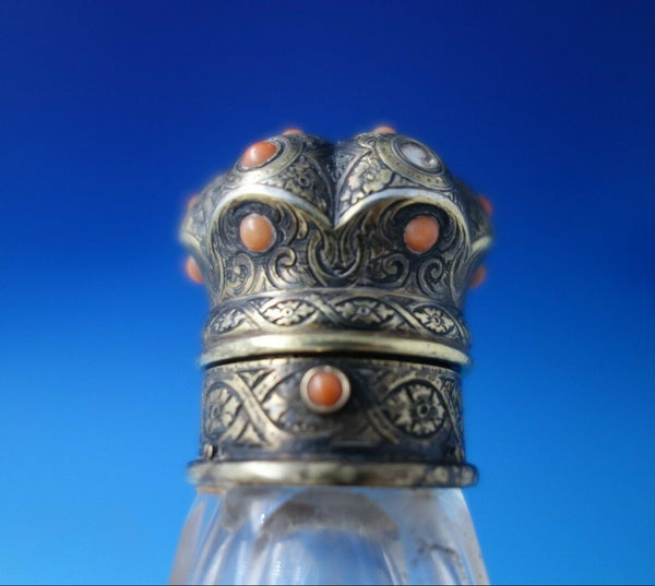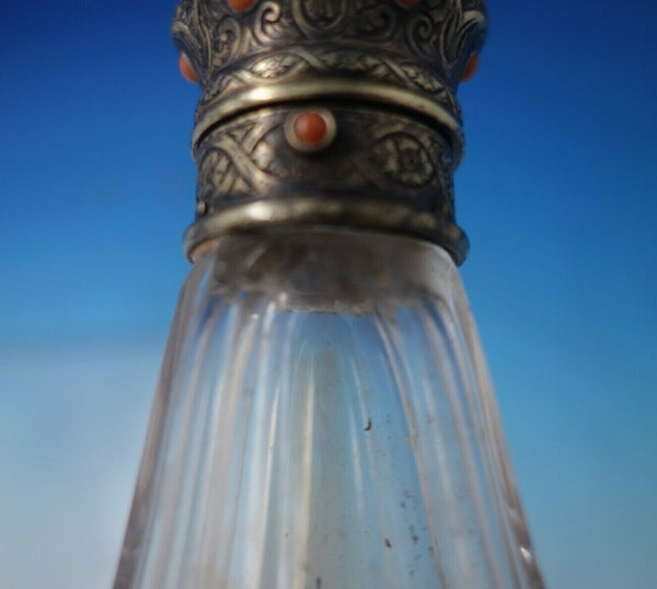 Sterling silver and cut crystal gilded perfume bottle with coral beads (maker unknown). This piece measures 4 3/4" x 2". It is not monogrammed and is being offered in as-is condition with one missing bead. Superb piece!