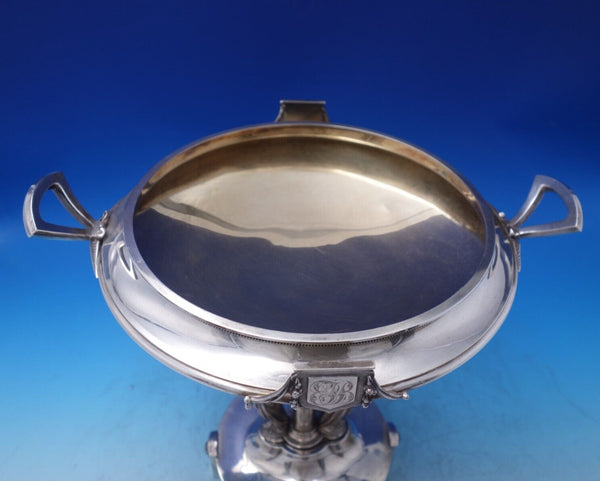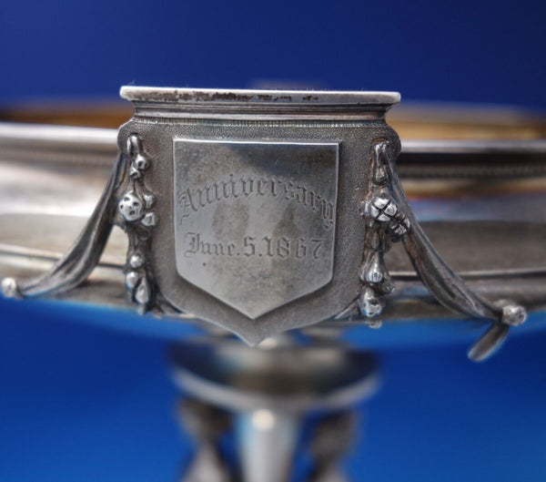 This centerpiece measures 12 1/2" tall x 10 1/2" and weighs 78.4 troy ounces. It has a monogram on one side and "Anniversary June 5, 1867" on the other (see photos). It is in good estate condition as shown in the photos. Extraordinary!