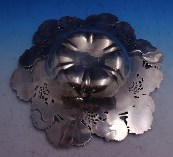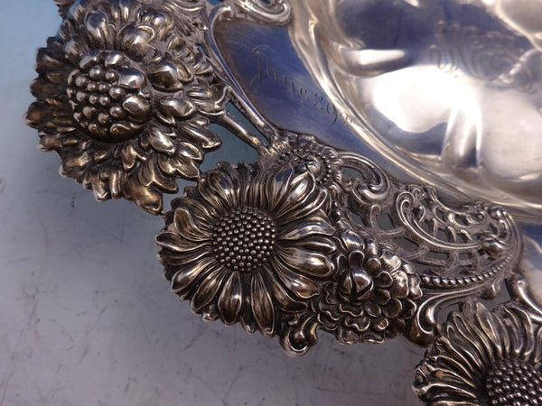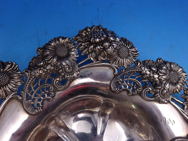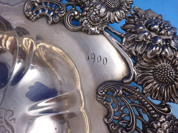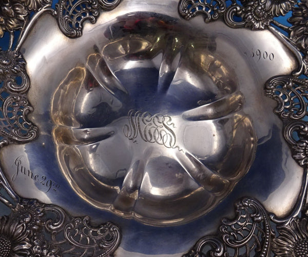 Dominick and Haff sterling silver fruit bowl with wide pierced floral rim, marked #1062, dated 1900. The rim features finely detailed flowers including daisies and chrysanthemums. This piece measures 12" in diameter x 1 3/4" tall and weighs 20.8 troy ounces. It is monogrammed (see photos), and is in good vintage condition. Beautiful!