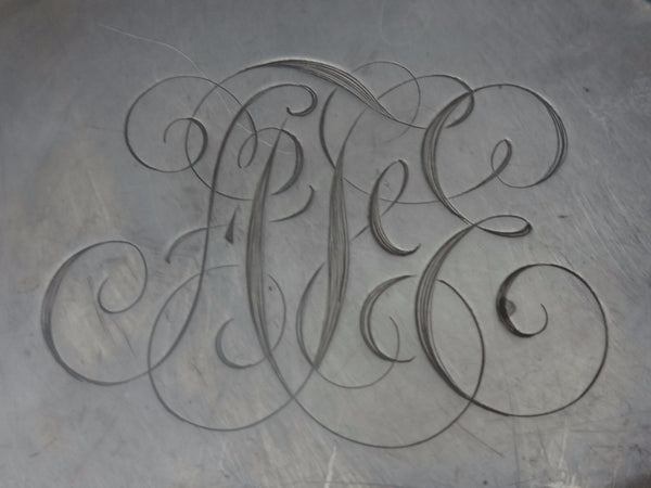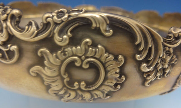 Impressive Dresden by Whiting sterling silver fruit bowl. It is footed with an applied floral and scrollwork design. The piece has a scrolly monogram in the center (see photo) and it's marked with #5470. The bowl is inscribed on the reverse (see photo) and dated 1901-1938. The measurements for the bowl are 2 1/2" tall, 8 3/4" wide, and it weighs 12.2 ozt. It is in excellent condition. Exquisite! SKU#0352.