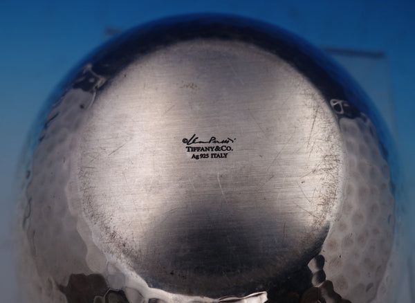 Gorgeous Elsa Peretti by Tiffany and Co sterling silver hand hammered thumbprint bowl with a beautiful ruby red interior made in Italy (retail $1,000). This piece measures 2 1/4" tall x 5" and weighs 5.1 troy ounces. It is not monogrammed and is in good estate condition as shown in the photos. Outstanding piece!
