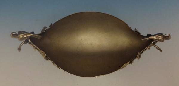 This very impressive sterling silver compote was made by Gorham. It has 3-D cockatoo birds and handles in the form of applied branches with leaves. The interior has a stippled or frosted finish. The piece is marked with #20 and "F" date letter for 1873. It measures 4 1/2" tall, 10" wide, and it weighs 8.9 ozt. It is not monogrammed and is in excellent condition. A true work of art! SKU#0404.