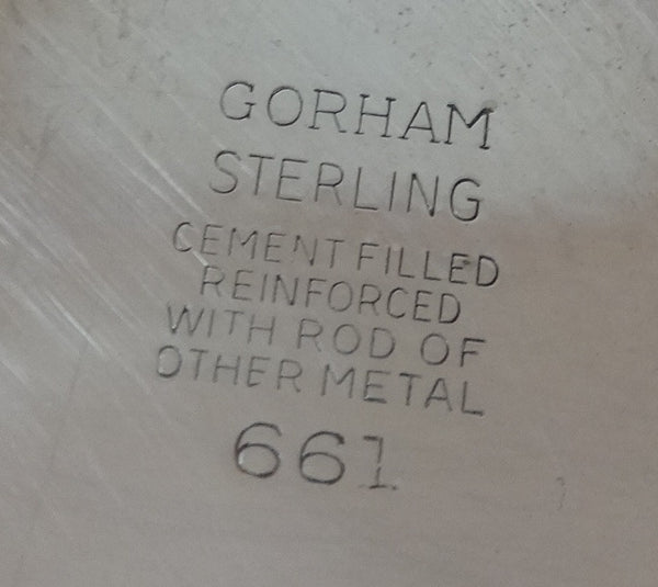 This mid-century raised compote was made by Gorham.  The piece has a sterling silver base with a black melamine insert.  The measurements for the compote are 7" in diameter x 4 1/2" tall.  It is not monogrammed and is in excellent condition.
