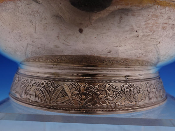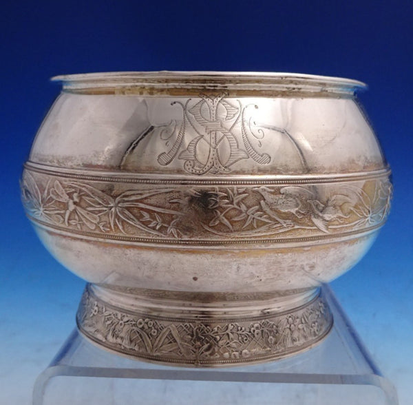 Exceptional Japanese by Gorham sterling silver waste bowl marked #155. This bowl features birds, foliage, dragonfly, and bamboo designs.