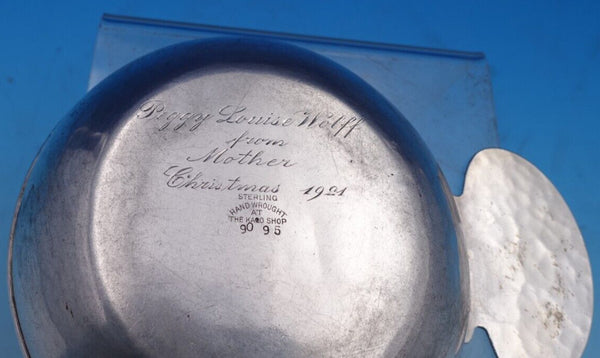 Wonderful Kalo sterling silver handwrought porringer marked #9095. This porringer measures 1 3/4" x 6" and weighs 5.1 troy ounces. It has an applied monogram on the handle "Peggy" with an engraving on the underside "Peggy Louise Wolff from Mother Christmas 1921" (see photos). It is in good estate condition as shown. Charming!