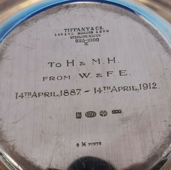 April, 1912 (25th anniversary), stamped 3 ½ Pints. It measures 4" Tall x 12" diameter and weighs 31 ozt. It is in excellent condition. Fabulous!