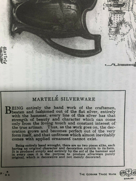 Martele was Gorham's most expensive and most desirable silver. When all pieces were then being machine made, Gorham brought together in their most talented silversmiths and opened one department to make silver Martele' by hand.