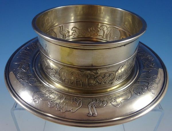 Exquisite Gorham sterling silver 2-piece child's set featuring acid etched animals going 2 by 2. This set includes a bowl that is marked with #A12394 and an underplate that is marked with #A12395. The bowl measures 2 1/2" x 4", and the underplate is 6 1/2" in diameter. The underplate has an inscription date of May 12, 1935 (see photo), and the set has date marks for 1925-27. Together the set weighs 8.15 ozt. This set is not monogrammed and is in excellent condition.