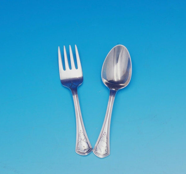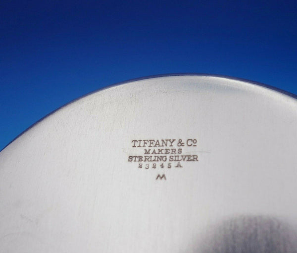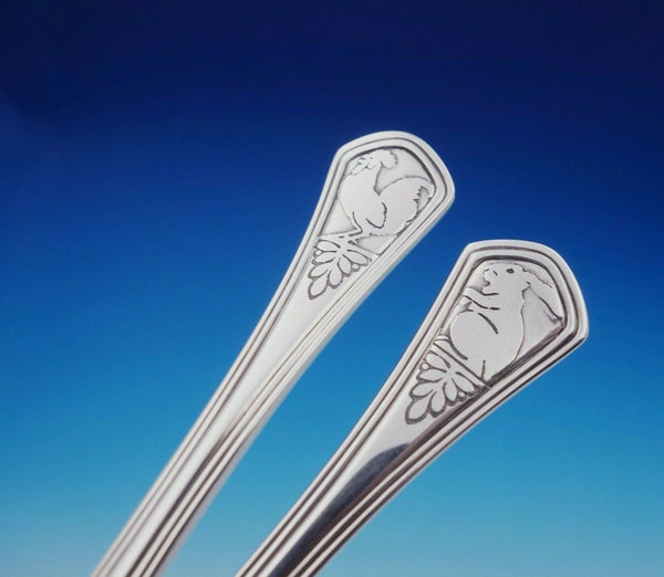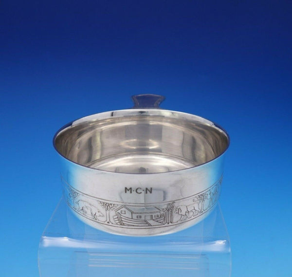 Beautiful Noah's Ark by Tiffany and Co sterling silver 3-piece child's set. The set is acid etched with animals and Noah's Ark. The porringer is marked #23245A with date mark 1947-56, and it measures 1 3/4" tall x 6 1/8" (with handle) x 4 1/4" in diameter. The fork and spoon measure 4 1/2", and the set weighs 8.4 troy ounces. This set has a vintage monogram (see photos) that can be removed upon request. It is in excellent condition. Charming!