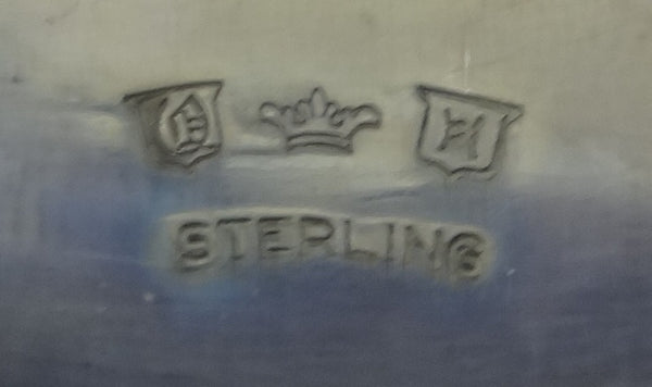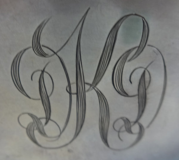 This exquisite sterling silver centerpiece bowl was made by Quaker Silver Co. of Massachusetts circa 1926-59, and then became part of Gorham. The bowl has a pedestal base with acanthus leaves and 3-D lion's head. It has a "DKD" monogram, and it measures 5 3/8" tall, 8 1/4" in diameter, and it weighs 23.11 ozt. It is in excellent condition.