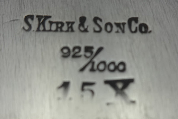 Repousse by Kirk large sterling silver fruit bowl.  It has a fancy monogram on the reverse.  It's marked with #15X and 925/1000, and it dates from 1896-1924.  It measures 2" tall, 10" in diameter, and it weighs 15.4 ozt.  It is in excellent condition.