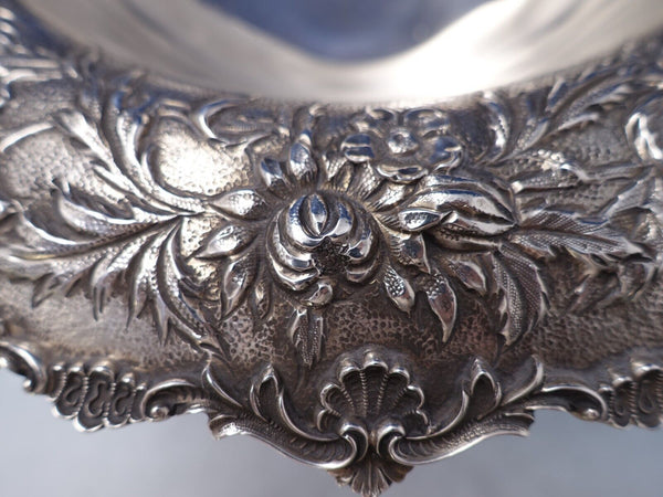 Beautiful Repousse by Kirk sterling silver footed centerpiece bowl marked #239 Hand Decorated. This piece measures 4 1/4" x 11" and weighs 24.7 troy ounces. It is not monogrammed and is in excellent condition. Fabulous!