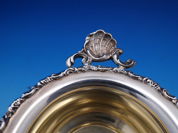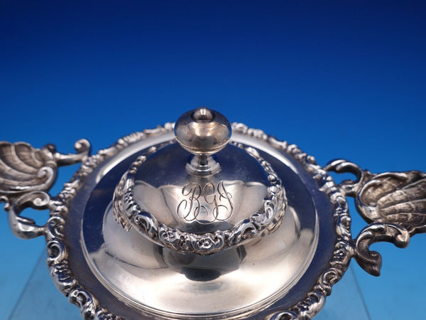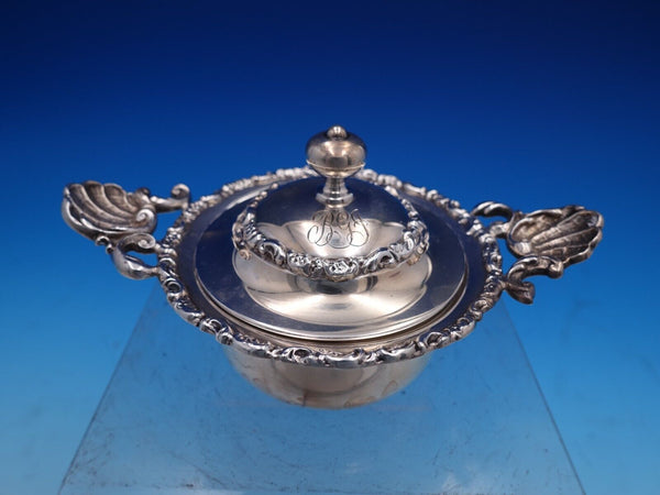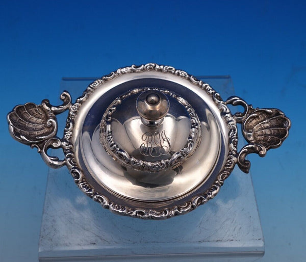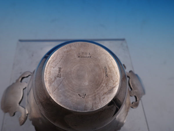 Exceptional Sea Motif by Mauser sterling silver terrapin bowl with cover and underplate featuring sea shell handles and wave design. It is marked #5701. The bowl with cover measures 2 1/2" tall x 5 1/2" and weighs 4.0 troy ounces. The underplate measures 1/4" tall x 5 1/2" in diameter and weighs 2.9 troy ounces. The pieces are monogrammed "BGJ" (see photos), and are in good estate condition. Amazing!