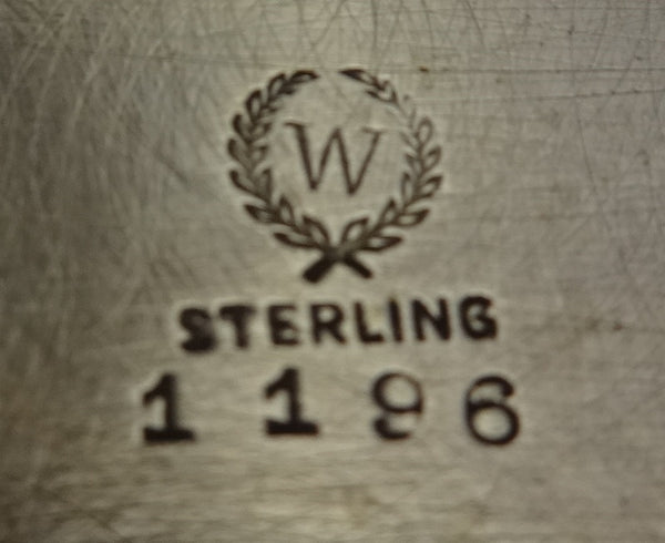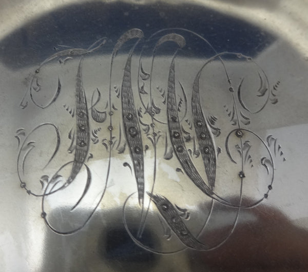 Very pretty strawberry sterling silver fruit or berry bowl made by Woodside Sterling Co. of New York circa 1896-1925. The bowl features detailed raised strawberries and leaves. It has an ornate scrolly monogram and it's marked with #1196. It measures 1 1/4" tall, 7 1/4" in diameter, and it weighs 4.4 ozt. It is in excellent condition. Exquisite! SKU#0620.