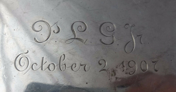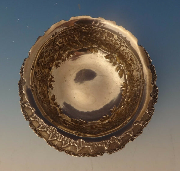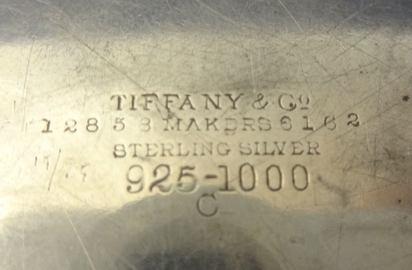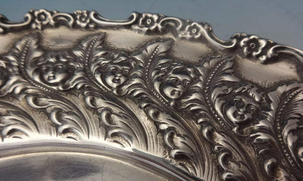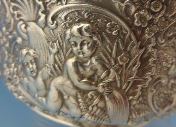 This incredible child&apos s 2-piece sterling bowl and plate set was made by Tiffany Co. The bowl has adorable repoussed scenes of full figured cupids picking grapes, among the cattails, with swags of flowers, by a waterfall, etc. The plate has a border of cupid faces repoussed with feathers. The pieces are marked with a " C" date mark for 1902-1907 and #12833/6162. There is a monogram that reads " PLG. Jr. October 2, 1907" . The plate measures 1/2" tall and 7" in diameter, the bowl is 2 3/4" tall and 5 1/4" in diameter, and the set weighs 15.4 ozt. It is in excellent condition. Crisp, superb detailing. SKU#0111.