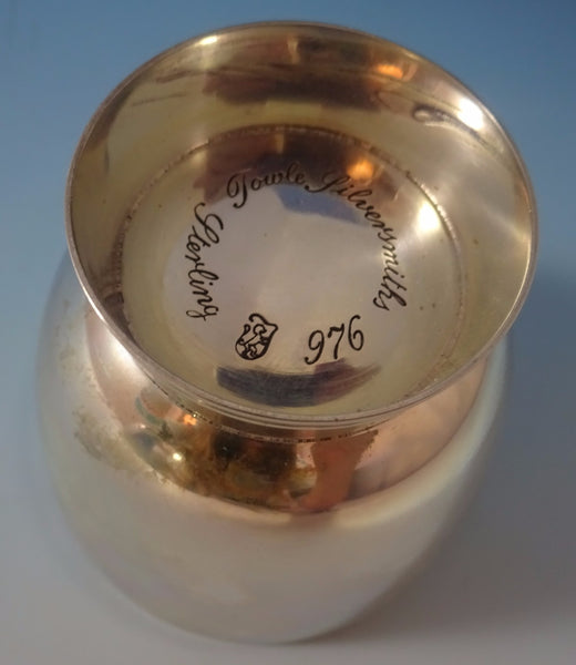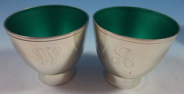 There are eight cups including six cups with no monograms, one cup with a "W" monogram, and one cup with an "A" monogram (see photos). The cups are marked with #976. The punch bowl measures 6 1/2" tall x 12" diameter, and it weighs 65.31 ozt. The cups measure 2 1/2" x 2 1/2", and they each weigh 3.2 ozt. (25.6 ozt total for cups)