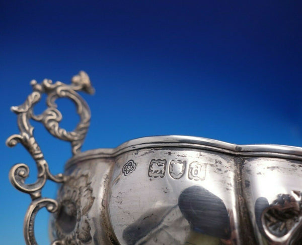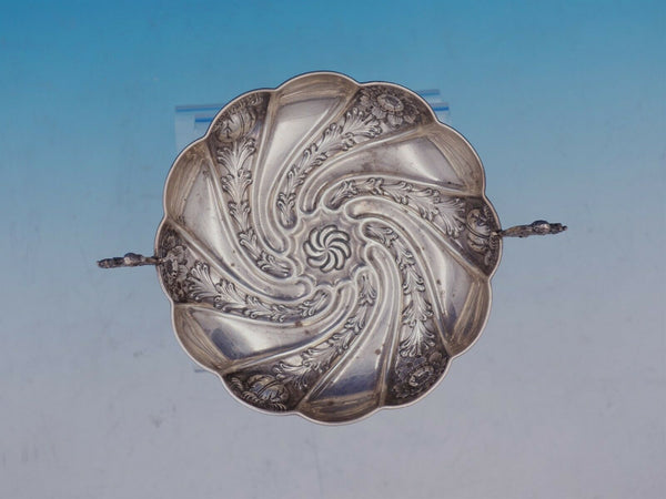 English Sterling Silver Victorian candy dish London 1899 with pedestal base, cast figural handles, and repoussed swirling flowers in the bowl by JBC (Carrington Co.- John Bodman Carrington). It measures 3" x 5" diameter and weighs 4.38 ozt. It is not monogrammed and is in good vintage condition. Unique piece!