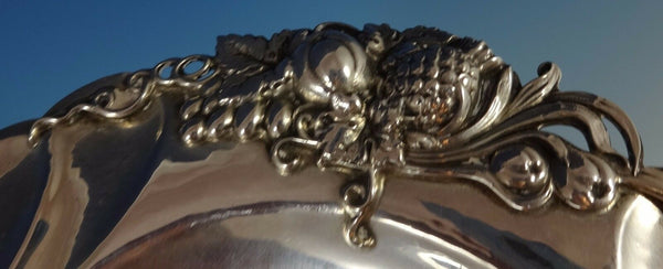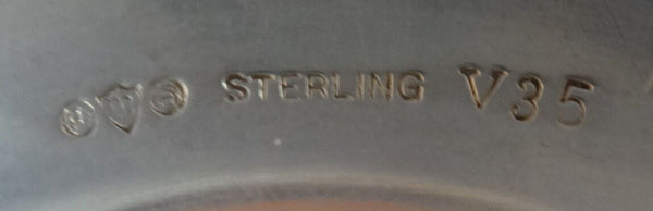 This Arts Crafts sterling silver compote was made by Watson in the Watsoncraft line and is marked #V35. The piece is hand hammered and features a grouping of fruit. It measures 7 1/2" in diameter x 3 5/8" tall and it weighs 9.6 ozt. It is not monogrammed and is in excellent condition.