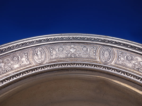 This piece measures 9 7/8" in diameter (at rim) x 3" tall and weighs 14.7 troy