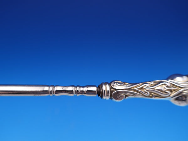 Sterling silver hollow handle with steel implement Button Hook in the pattern Love's Dream By Unger, which features an Art Nouveau design - an angel kissing a woman in the clouds. This piece measures 8 1/2" i length. It is not monogrammed and is in good vintage condition with some minor distortion/bend to the hook portion, as shown. Offered as-is.