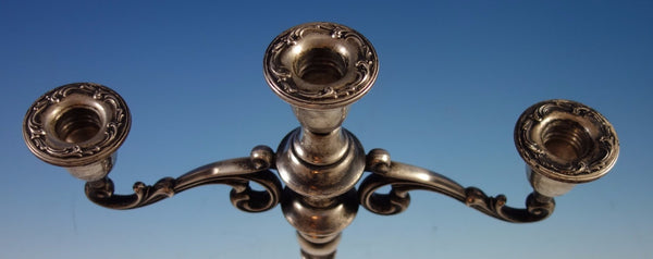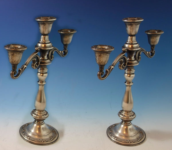 Angelique by International sterling silver pair of candelabras. The candelabras are 3-lite and are marked with #127/65. The pair measures 13 1/2" tall and 12" wide. They are not monogrammed and are in excellent condition. Impressive!