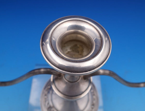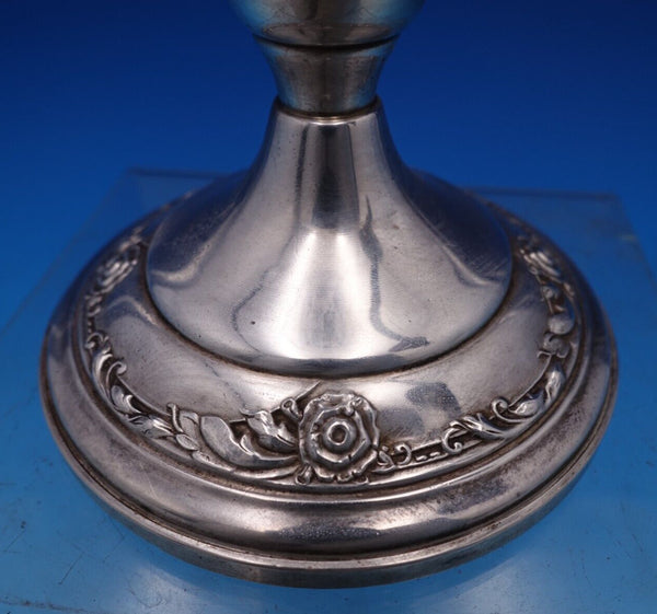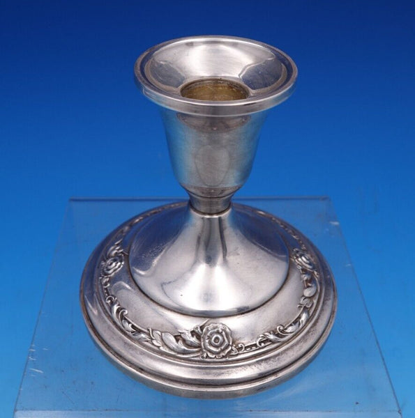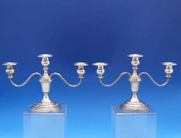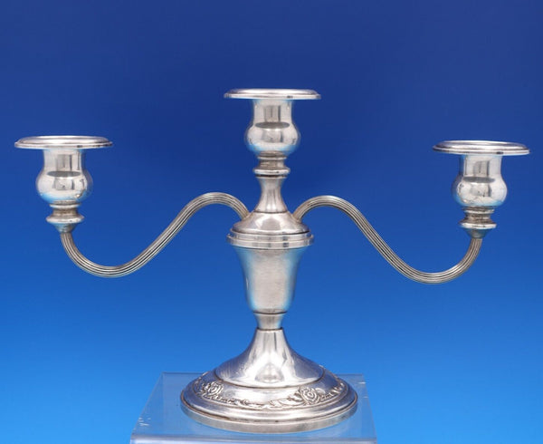 Beautiful Damask Rose by Oneida sterling silver three-light candelabra pair marked #38. The pieces measure 7" tall x 10 1/2" and are weighted. They are not monogrammed and are in good estate condition as shown in the photos. Wonderful!
