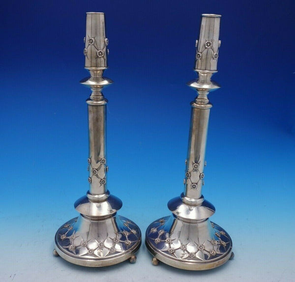 Magnificent Forget Me Not by Hadad sterling silver candlestick pair. The pieces measure 14 3/4" tall x 5 3/4", and the total weight of both is 29.5 troy ounces. This set is not monogrammed and is in good vintage condition. Stunning set!
