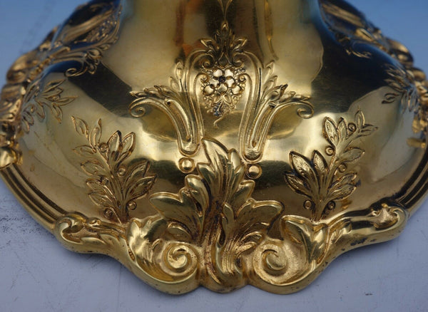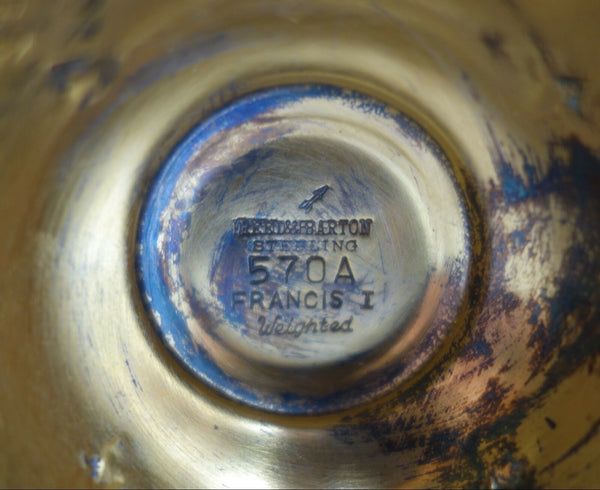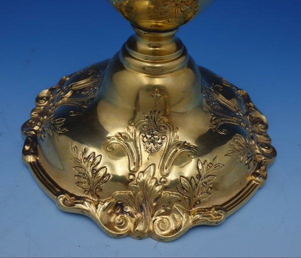 Outstanding Francis I by Reed and Barton sterling silver hand chased candlestick pair marked #570A. The pair are vermeil (completely gold washed) the gold can be removed upon request. The pieces measure 10 1/2" tall and 5" diameter at the base and are weighted. They are not monogrammed and are in excellent condition. Incredible!