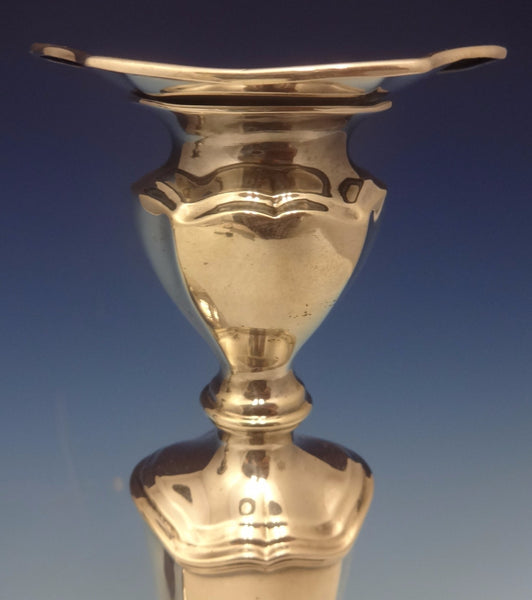 Pair of tall Hepplewhite by Reed Barton sterling silver candlesticks #560. These pieces are weighted and measure 10" tall and 5 3/4" wide. They have a scrolly monogram (see photo) and date to the 1920's. They are in excellent condition. Stunning pair! SKU#0434.