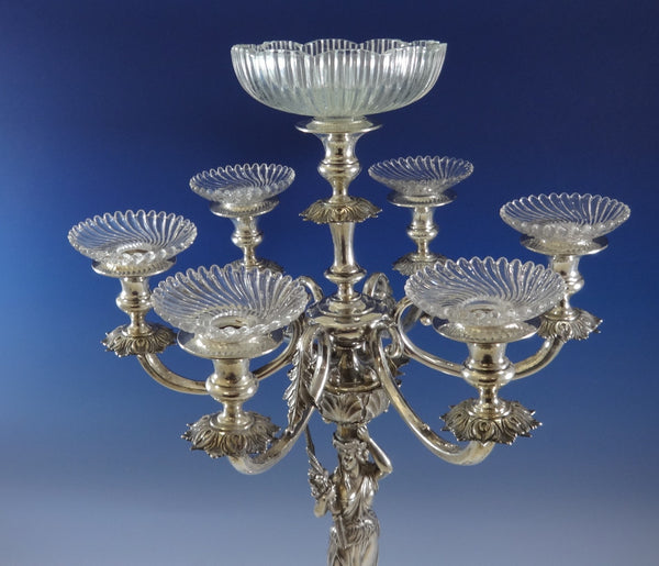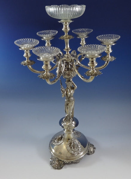 Magnificent Austrian Succession 800 Silver MASSIVE CANDELABRA PAIR 7-LIGHT. Each candelabra features a Grecian style man / woman in exceptional detail. On the base of each are three applied highly three-dimensional cameos framed with applied laurel leaf wreaths with bows at the bases of each figural cameo. The feet are figural design of the "North Wind". Each light can hold a removable glass bobeche (one appears replaced, a few chips in some of the glass). The smaller glass bobeches measure approx. 3 1/2" in diameter and the large central glass bowl measures approx 5 1/2" in diameter. It is not monogrammed and is in excellent overall museum quality condition.  SKU#0088.