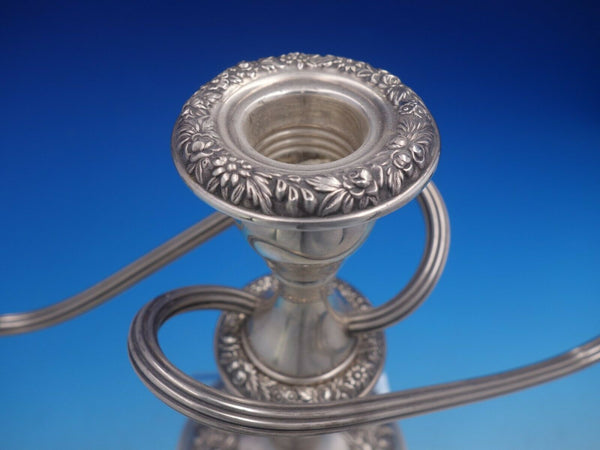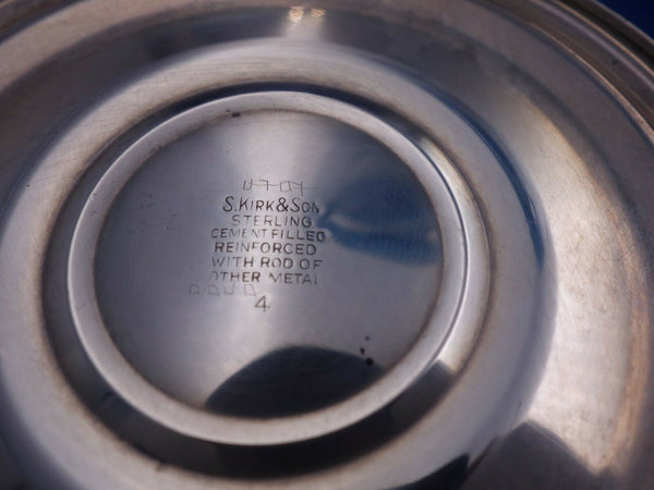 Repousse by Kirk weighted sterling silver 3-light candelabra marked #4. It measures 7 1/2" x 11" . It is not monogrammed and is in good vintage condition. Remarkable piece!
