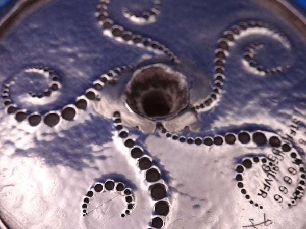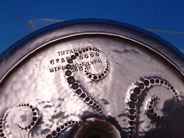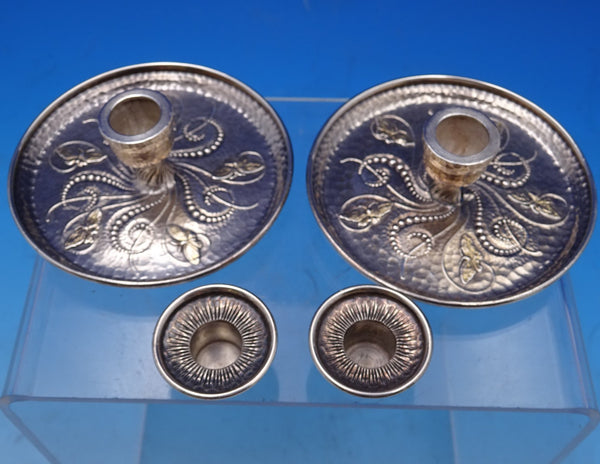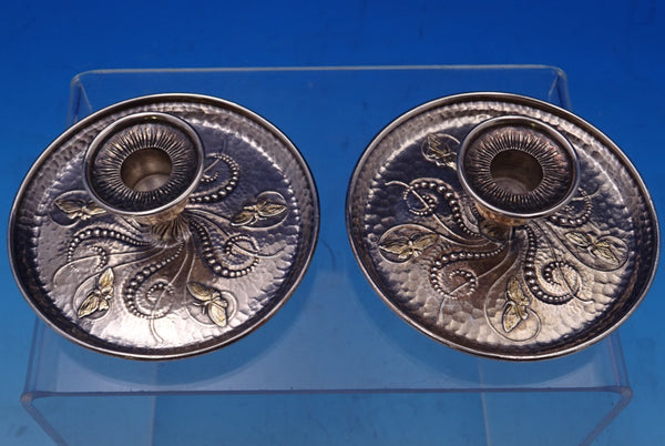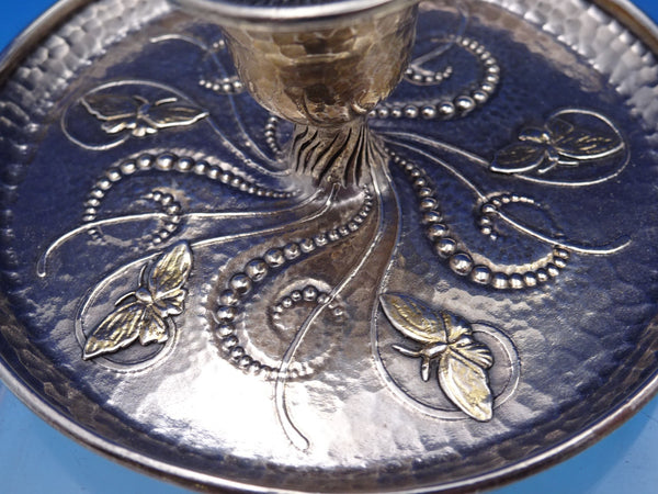 Exceptional Tiffany and Co sterling silver hand hammered candlestick pair featuring applied gold butterflies, circa 1880. The candlesticks measure 3" x 2 1/2" and together weigh 4.2 troy ounces. They are not monogrammed and are in good estate condition as shown, with one having an old repair on the bottom. Beautiful!